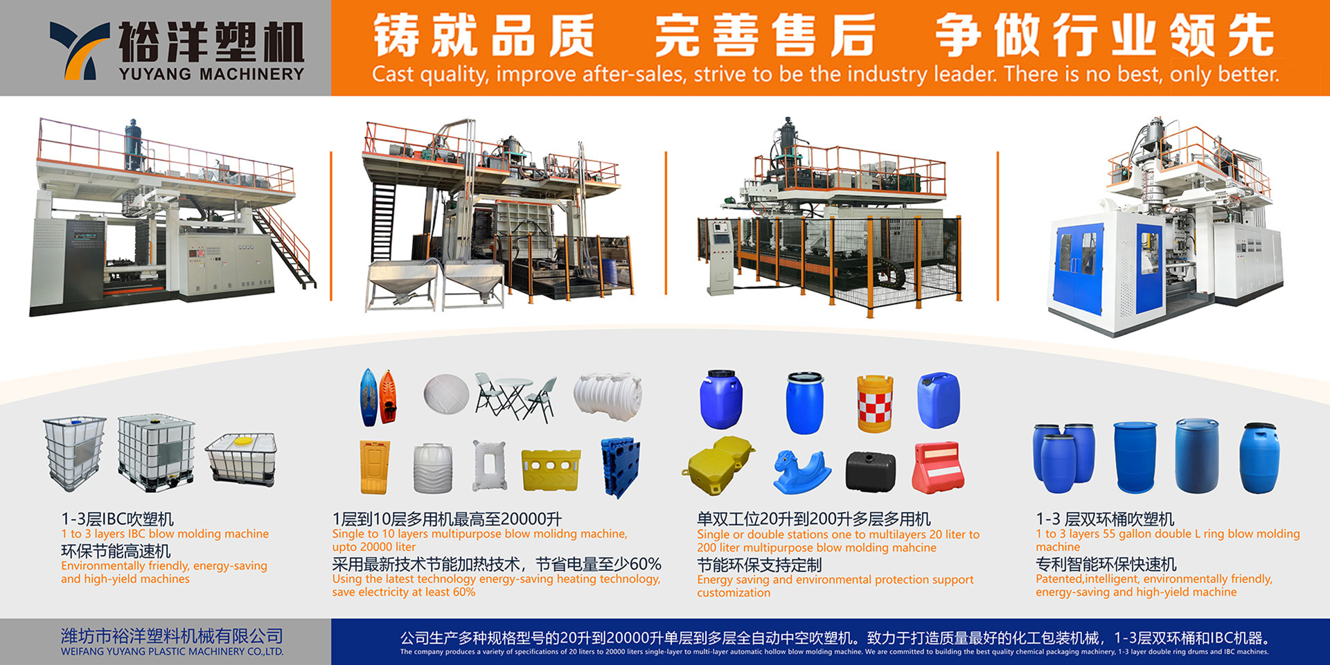 Weifang Yuyang Plastic Machinery Co., Ltd., ubicada en Weifang, Shandong, China, es una empresa nacional de alta tecnología de primer nivel que se especializa en I+D independiente y producción de máquinas de moldeo por soplado. Con tecnologías de alta eficiencia y ahorro de energía como su principal competitividad, la empresa ofrece equipos de moldeo por soplado inteligentes, rentables y de alto rendimiento. Su gama de productos cubre contenedores industriales de 20 a 20.000 litros, incluidos tanques de agua, paletas, bidones químicos, IBC, etc., ampliamente utilizados en los sectores químico, alimentario, logístico, de protección medioambiental y agrícola. Los productos se exportan a más de 30 países y regiones de todo el mundo, lo que establece un punto de referencia para la 'fabricación inteligente de China' en el comercio internacional.